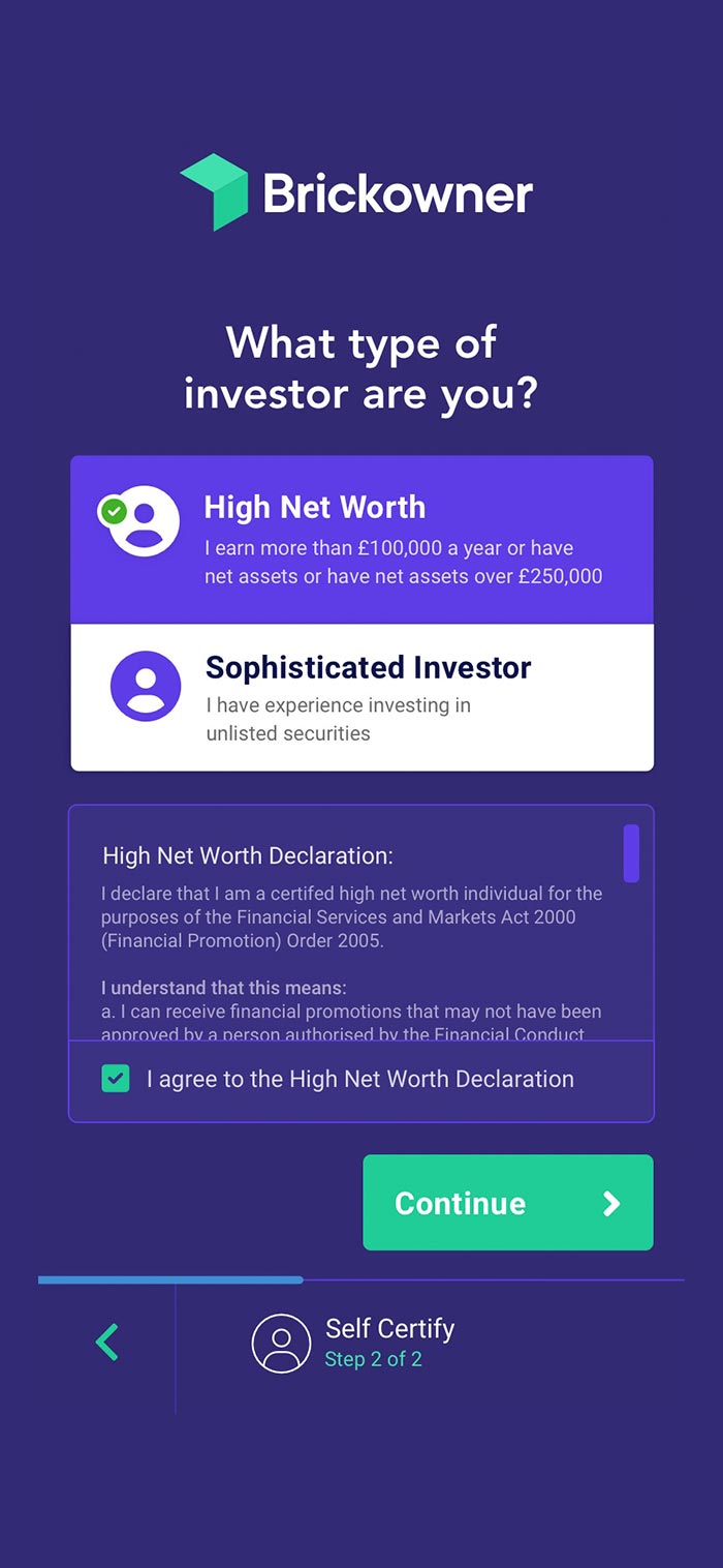 It takes minutes to create a Brickowner account. Due to the nature of each investment, these opportunities are only available to certain types of investors. You will need to self certify confirming that you fall into one of the required categories.